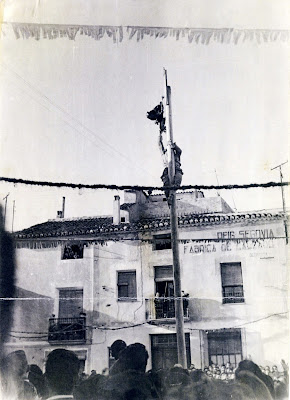 Un valiente subiendo por el largo poste resbaladizo en el centro de la Plaza de Biar, para recoger su trofeo, parece una gallina, lo conseguiría... Con el tiempo este juego de la cucaña se perdió.