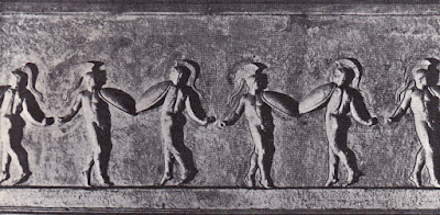 La más célebre de las danzas militares griegas era la danza Pírrica, representada en este bello relieve llamado <de los Coribantes>.Pocas cosas ha habido en la Historia de la humanidad de tanta importancia para la Historia y para la humanidad.