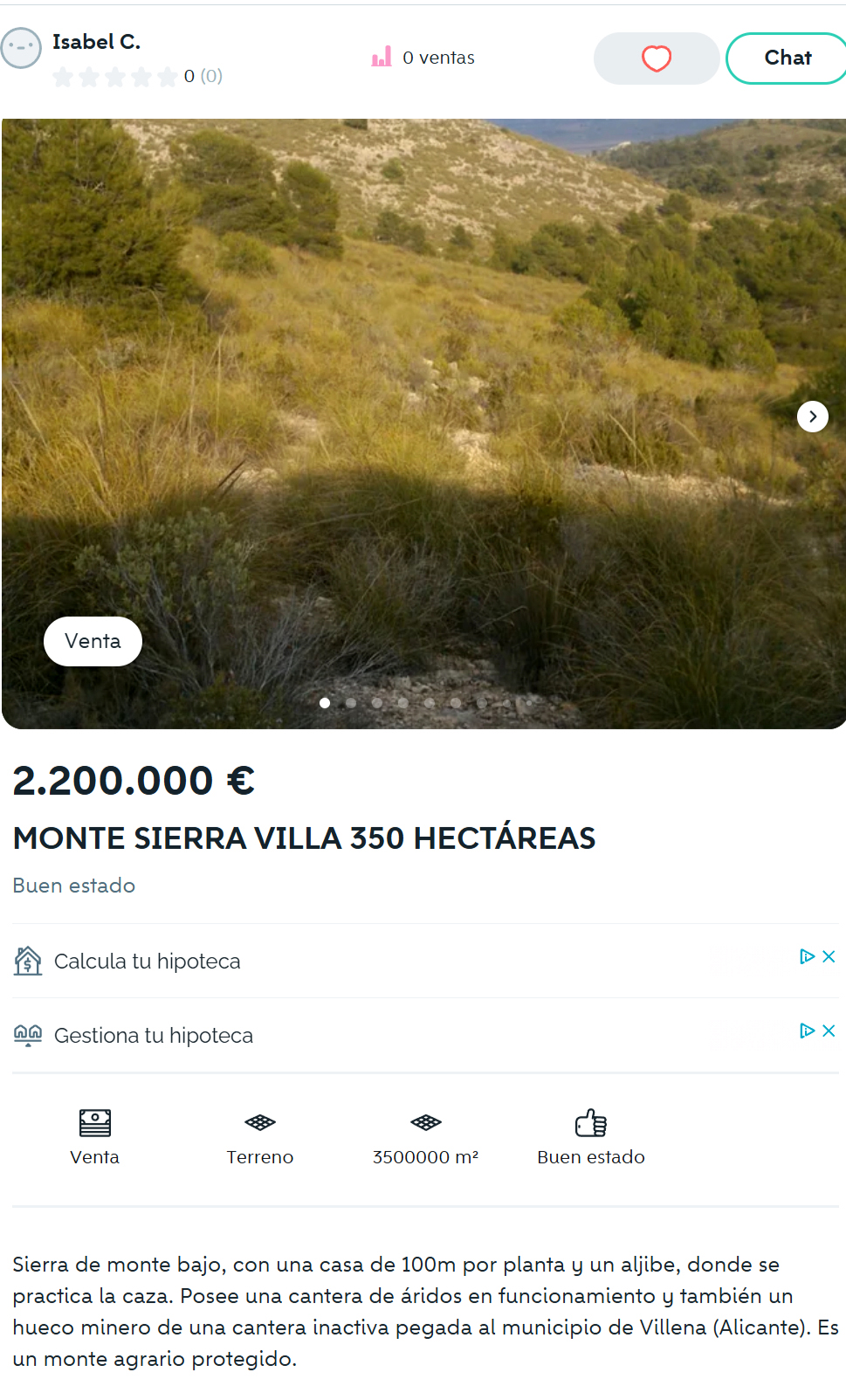Se vende la sierra de la villa de Villena por 2.200.000 euros en Wallapop.
