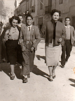 Lola y Pepe García Navarro y Pepita Reig Muñoz, posiblemente por la actual Gran Vía de Sax en Fiestas de Moros y Cristianos, fotografía fechada el 3 de febrero de 1953.