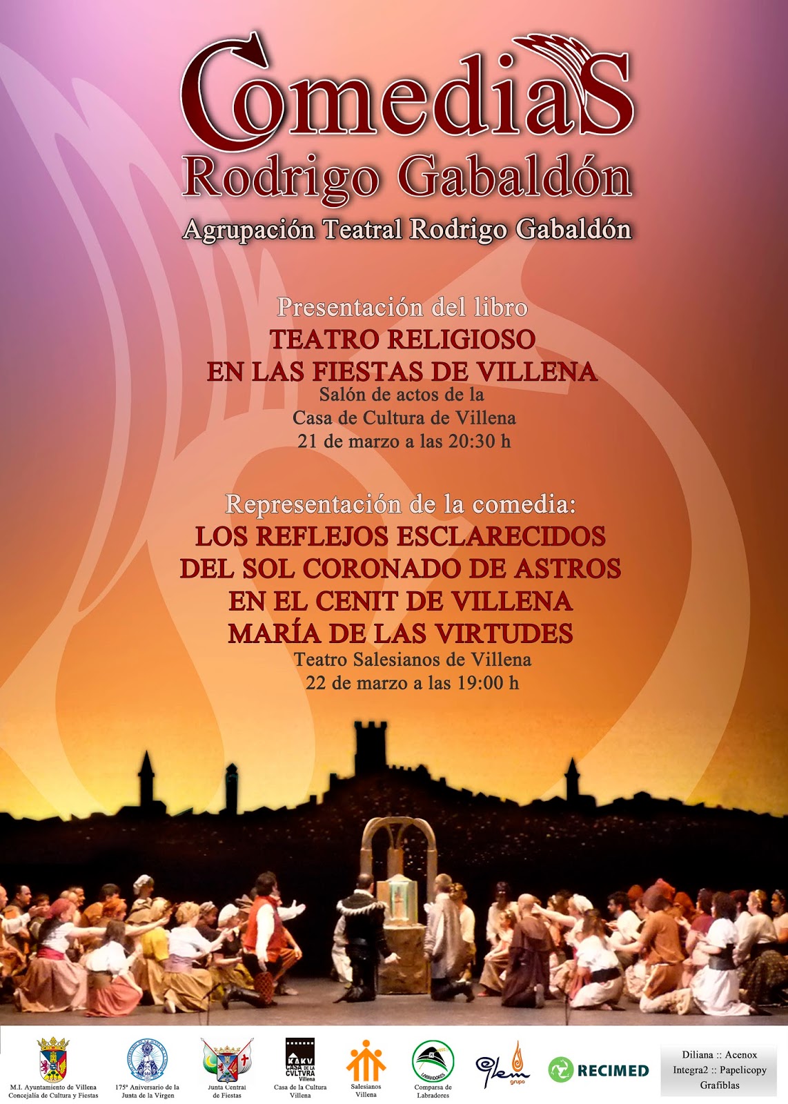Sabado 22 de marzo de 2014 - Representación de la obra, las comedias de Rodrigo Gabaldón, a cargo de la Agrupación del mismo nombre, en el Teatro Salesiano a las 19:00 horas. Con banda sonora de Gaspar Angel Tortosa, Actores consagrados aficionados de Villena y mas de cincuenta extras pertenecientes a la comparsa de masero. Además tendrá novedades en cuanto a decorados realizados por Pepoe Pastillo.